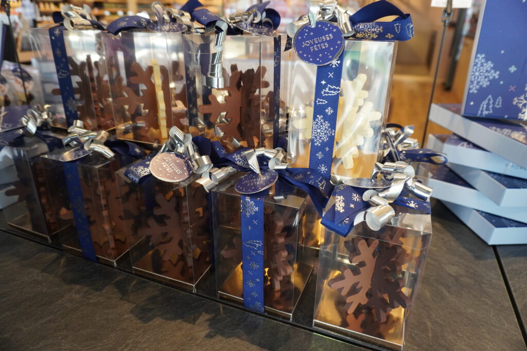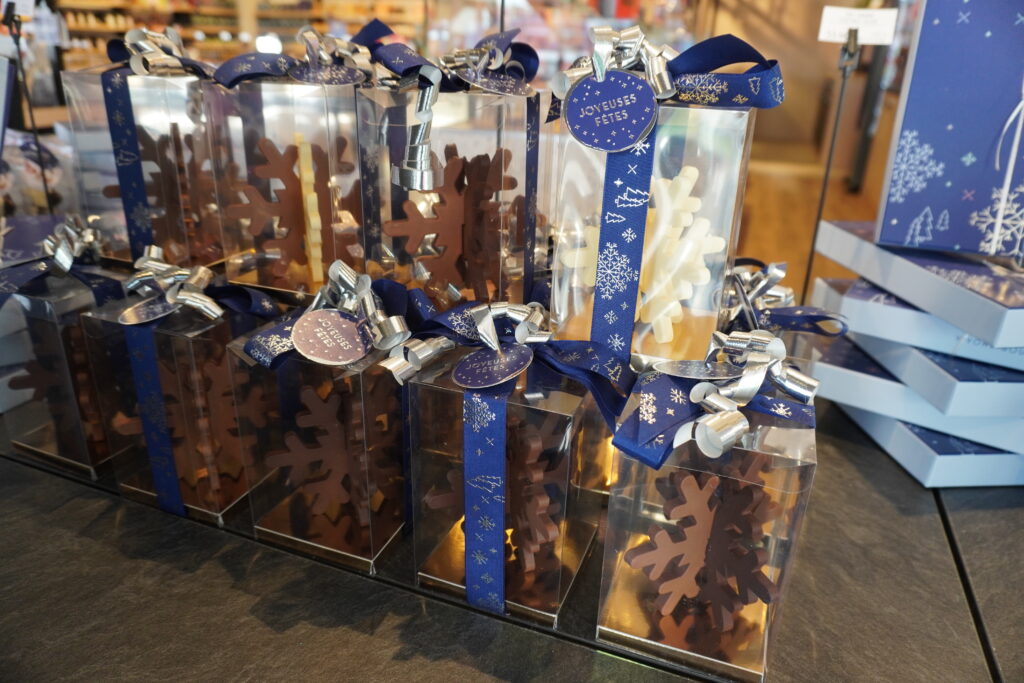 Aurélien Maheut nous présente les différentes sortes de chocolat comme les flocons, le Père Noël, les petits cadeaux invités, les figurines…