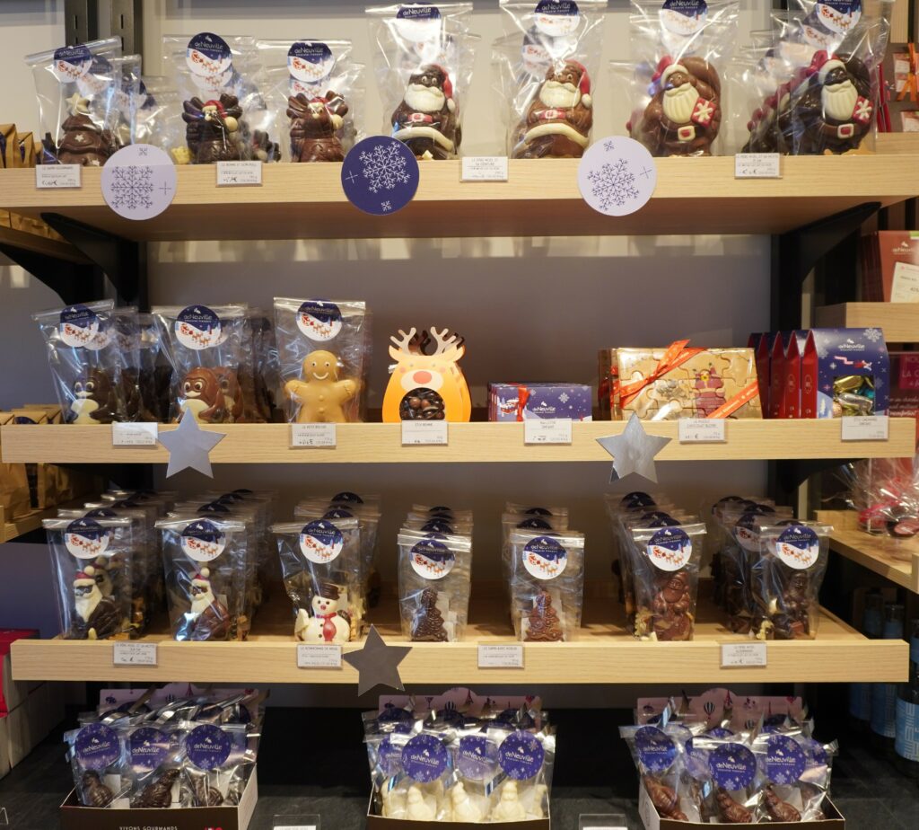 Au Chocolat De Neuville à La Teste, Aurélien nous présente sa vitrine de Noël avec ses spécialités et les nombreuses visites du Père Noël