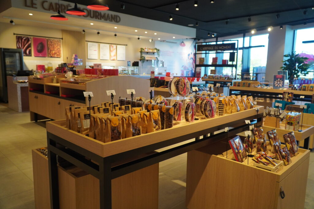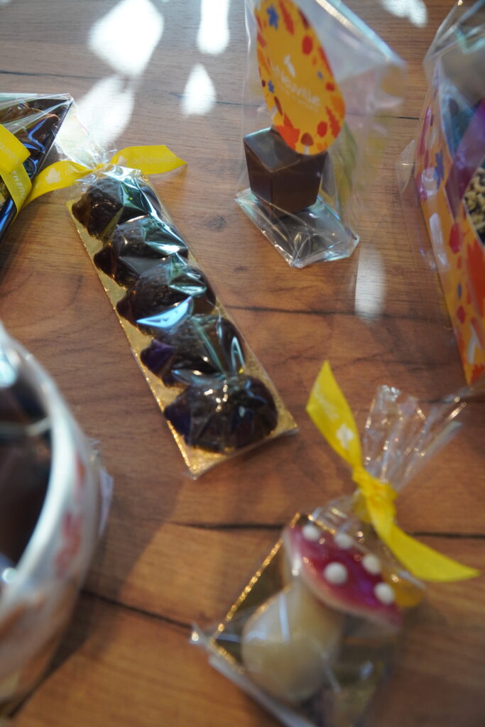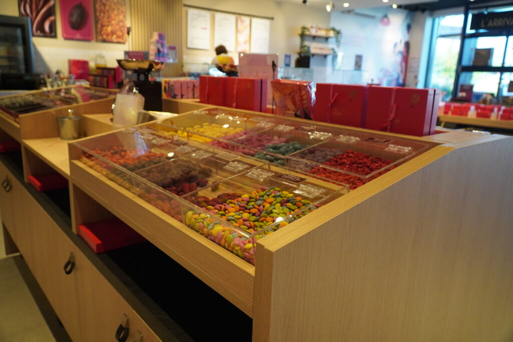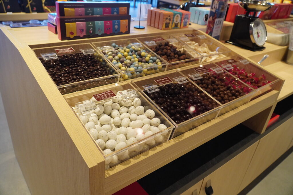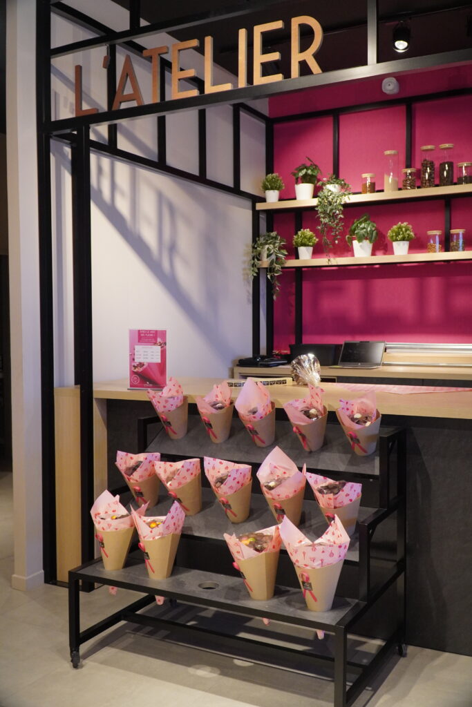 De plus, un espace vrac est à disposition de la clientèle qui pourra composer son assortiment de confiseries, d’écrire un message avec des carrés de chocolat ou encore de se procurer des bouquets personnalisables depuis l’atelier…