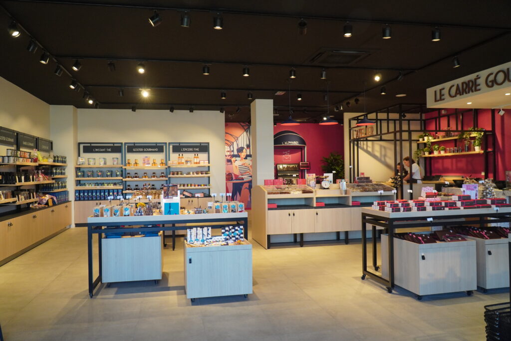 Lorqu’on passe la porte, on peut voir des produits français provenant des différentes régions comme des jus de fruits, des biscuits, du café, du thé, du cacao en poudre et une gamme de produits salés…